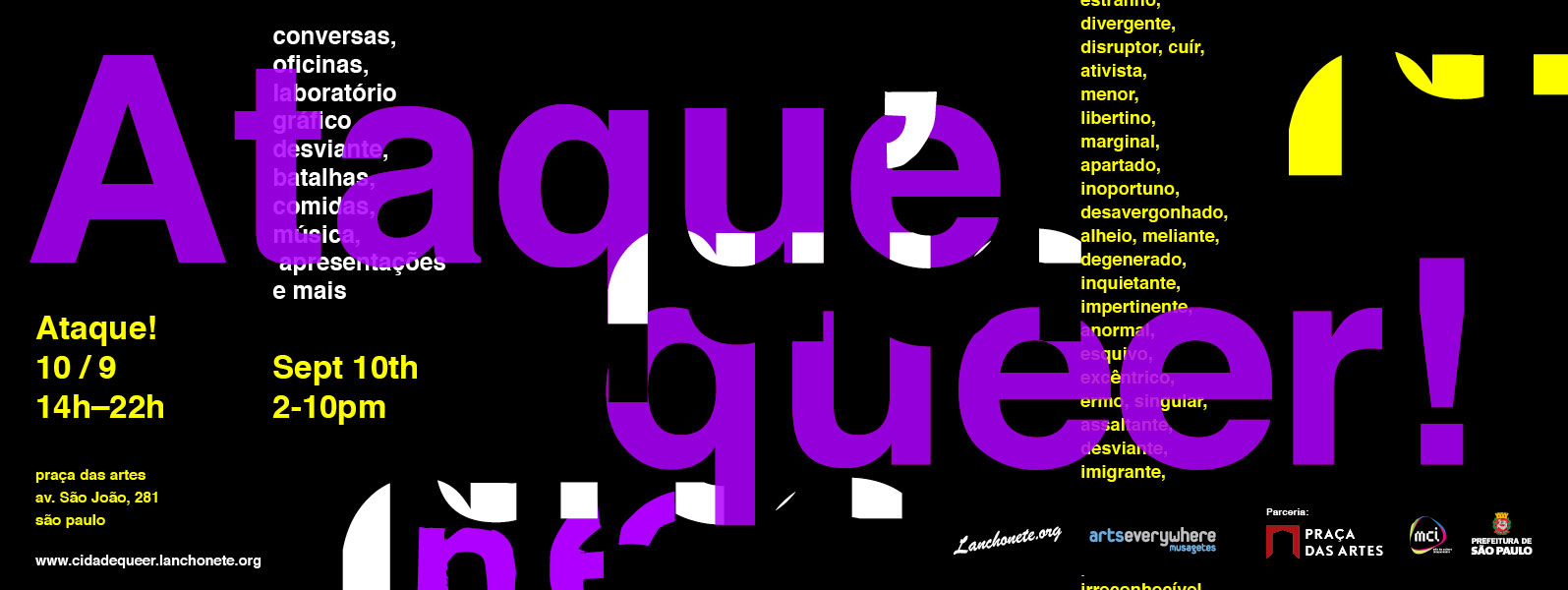 Finalizando o ciclo de atividades Cidade Queer / Queer City, uma parceria entre a residência artística Lanchonete e a fundação canadense Musagetes, a Praça das Artes vira palco para uma batalha de dança que questiona as estruturas hegemônicas da cidade e a normatização de nossa sociedade. Ataque! é uma competição de dança inspirada na cultura de ball room consagrada em Nova York e que foi muito bem retratada no documentário “Paris is Burning”.