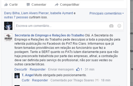 Atualização sobre o caso de preconceito do PAT de Rio Claro