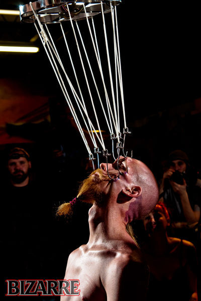 (Primeira imagem de cima foi feita em Fevereiro deste ano na Fetish Revolution (Phoenix, AZ). Realizada por Bill Robinson da Stay Classy Suspensions. Neil puxou para cima Tarah Robinson, deixando-a em um suicide suspension. Foi uma colaboração com o Steve Haworth e Life Suspended na ocasião. A segunda foto é da APP 2011 quando CoRE performou para o 10º aniversário deles. A terceira foto é de uma transição de 5 posições, trataremos abaixo. A quarta imagem é de um Nightmare Before Xmas com AGRO Sideshow, onde foi realizada a ação de almofada de alfinetes humana e terminando com duas lanças de 2 gauges e um suicide.