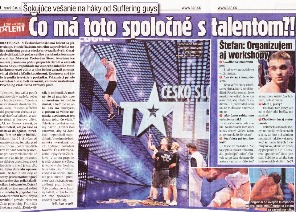 A República Tcheca e a Eslováquia também têm a sua edição e foi ela quem exibiu no ano passado uma demonstração de suspensão corporal. O CzechoSlovakia’s Got Talent levou a equipe do Suffering Guys para uma demonstração da suspensão através de um suicide de dois pontos. O programa exibiu o processo de perfuração, suspensão e deu espaço para que os convidados falassem, ainda que os jurados fizessem suas incansáveis caretas. Infelizmente não compreendemos o idioma e tão logo ficou impossível saber sobre o que falaram. A nossa sensação no papel de telespectador com conhecimento de causa é de um profundo esvaziamento da carga cultural, emocional e simbólica da prática. Tudo é muito cru.
