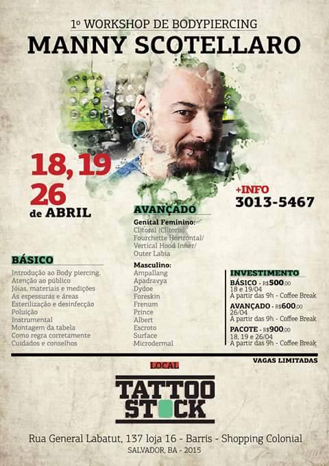 Manny Scotellaro é um body modifier argentino e estará em Salvador, Bahia, aplicando um workshop de body piercing. Dividido nas modalidades básico e avançado, o evento acontecerá nos dias 18, 19 e 26 de Abril. As inscrições já podem ser feitas e é possível parcelar o valor do curso.