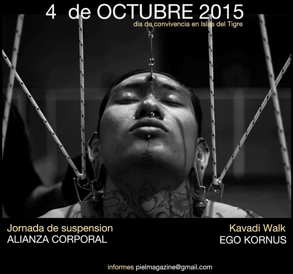11792022_936137323118017_618437008916622455_oEstá programado para acontecer em Outubro na Argentina um dia de convivência na Ilha do Tigre, com jornada de suspensão corporal com Matias Tafel e La Negra e um seleto time de assistentes. Como convidado especial, o encontro contará com a presença de Ego Kornus, levando o Kavadi Walk.  Será celebrado em conjunto o aniversário de La Negra.
