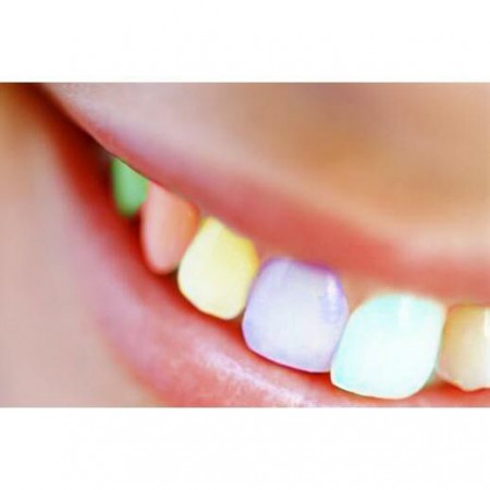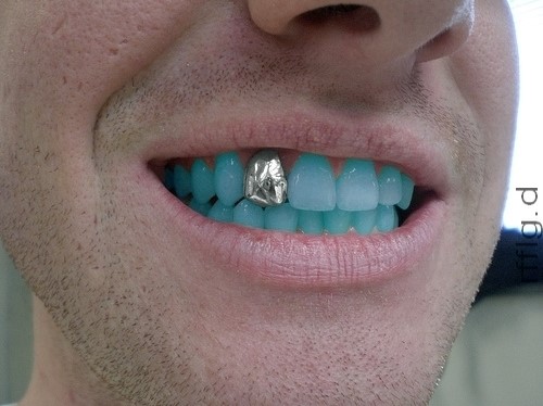 Dentre as possibilidades apresentadas no blog existe uma bastante interessante, e que se relaciona com essa discussão, que é a coloração dos dentes. A imagem é manipulada digitalmente, mas suscita novas – futuras – possibilidades. O mais próximo que chegamos até o momento é a coloração temporária dos dentes através de uma tinta inglesa, a Novelty Tooth Paint. O resultado aparentemente não fica como o da foto acima, mas como eu disse, é um começo. Pelo que aponta o site que vende o produto, a tintura é bastante resistente e de certa forma durável.