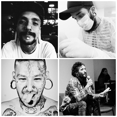 Participam do encontro: Alexandre L. Anami (SP) -profissional da modificação corporal, vai contar sobre sua trajetória e também falar de suas experiências pessoais com procedimentos mais extremos; Marcos Cabelo (BH) – profissional da modificação corporal e organizador da Hurt Fest, vai falar sobre suas experiências seja com a modificação corporal como também com a organização de um evento voltado para suspensão corporal; Rafa Piercer (BH) – profissional da perfuração corporal, vai nos contar sobre sua trajetória com o piercing, abordando aspectos políticos e sociais da prática em Belo Horizonte e T. Angel (SP), artista da performance, com graduação em História e pesquisando a modificação corporal nas últimas décadas, vai apresentar a proposta do GESMC e também discutir políticas e militância freak.