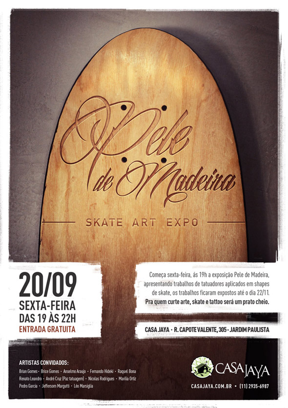 Começa na sexta-feira próxima (20) às 19h a exposição Pele de Madeira na Casa Jaya, apresentando trabalhos de tatuadores aplicados em shapes de skate. Os trabalhos ficarão expostos até o dia 22/11. Pra quem gosta de arte, skate e tattoo e um cantinho especial para tomar um chá e comer alguma coisa gostosa, lá será o lugar. Vernissage: 20 de Setembro de 2013, das 19 às 22hs Entrada gratuita! Artistas Convidados: Brian Gomes • Brice Gomes • Anselmo Araujo • Fernando Hideki • Raquel Bona • Renato Leandro • André Cruz (Paz tatuagem) • Nicolas Rodrigues • Marilia Ortiz • Pedro Garcia • Jeffersom Margutti • Léo Marsiglia