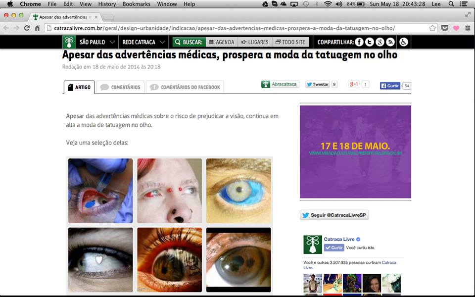 A matéria assinada por Redação – o que quer dizer que sim, corresponde a opinião do Catraca Livre – recebeu inicialmente o título pitoresco de “Apesar das advertências médicas, prospera a moda da tatuagem no olho“. Não satisfeitos, coletaram inúmeras imagens avulsas contendo implante ocular, eyeball tattooing, lente de contato, mudança de cor da íris e, inclusive, montagens de photoshop e generalizaram de maneira porca, como tudo sendo a mesma coisa, no caso, eyeball tattooing.