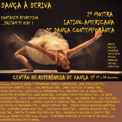 De 1 a 8 de dezembro acontece, no Centro de Referência da Dança de São Paulo (Baixos do Viaduto do Chá, s/nª, local onde funcionou até o início do ano a Escola Municipal de Bailado), o “Dança à Deriva – 2ª Mostra Latino-Americana de Dança Contemporânea”, que reúne trabalhos de 25 companhias, coletivos e artistas independentes, 13 vindos da Colômbia, México, Costa Rica, Bolívia, Paraguai, Uruguai, Venezuela e 12 brasileiros de São Paulo, Bahia, Ceará, Minas Gerais e Rio Grande do Sul. Toda a programação, composta de apresentações cênicas, videodança, intervenções, saraus, workshops e fóruns de debates, é aberta ao público.