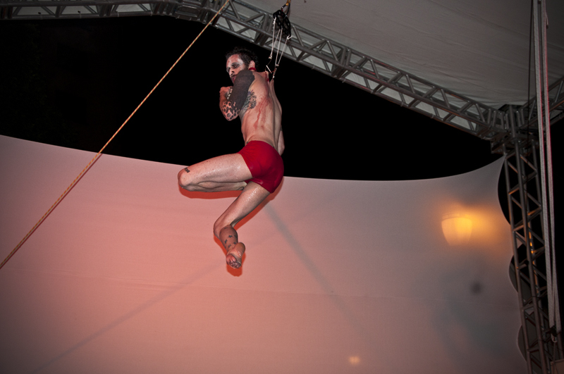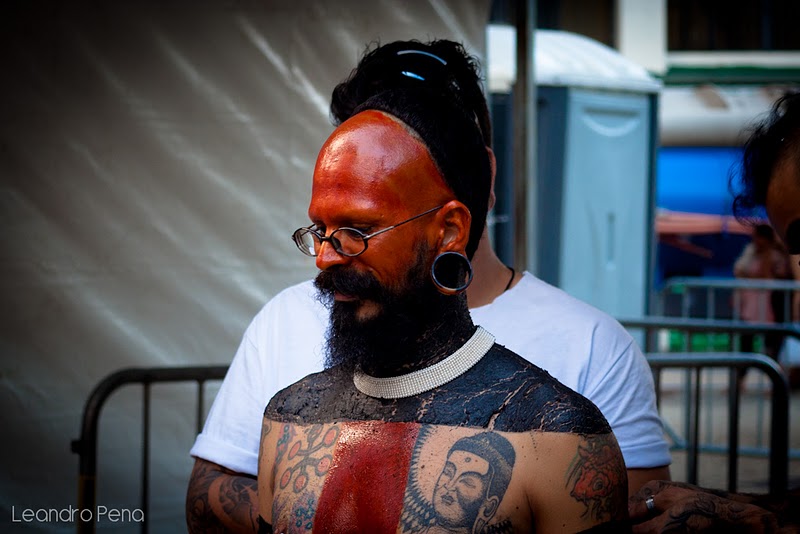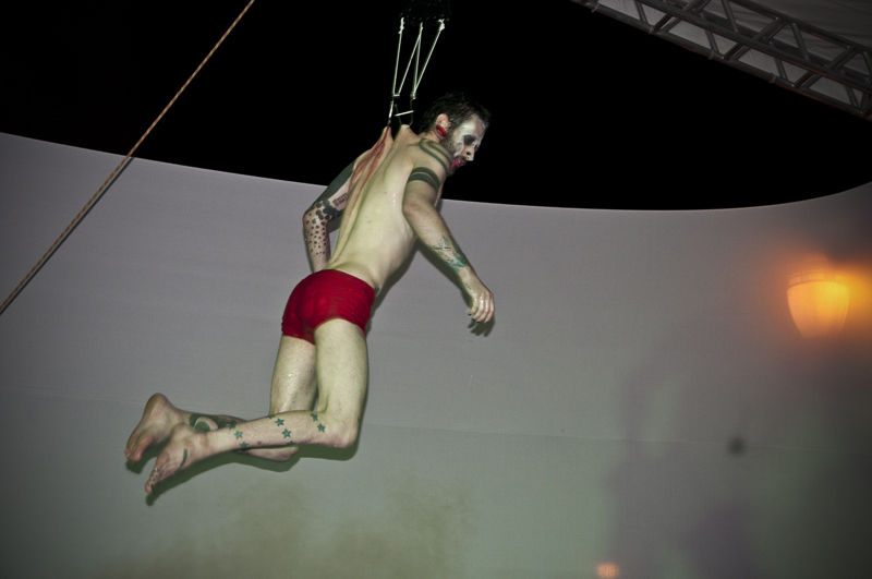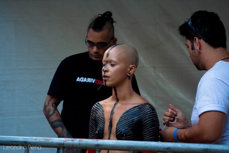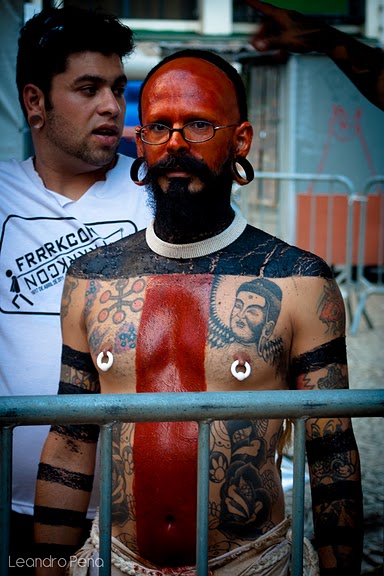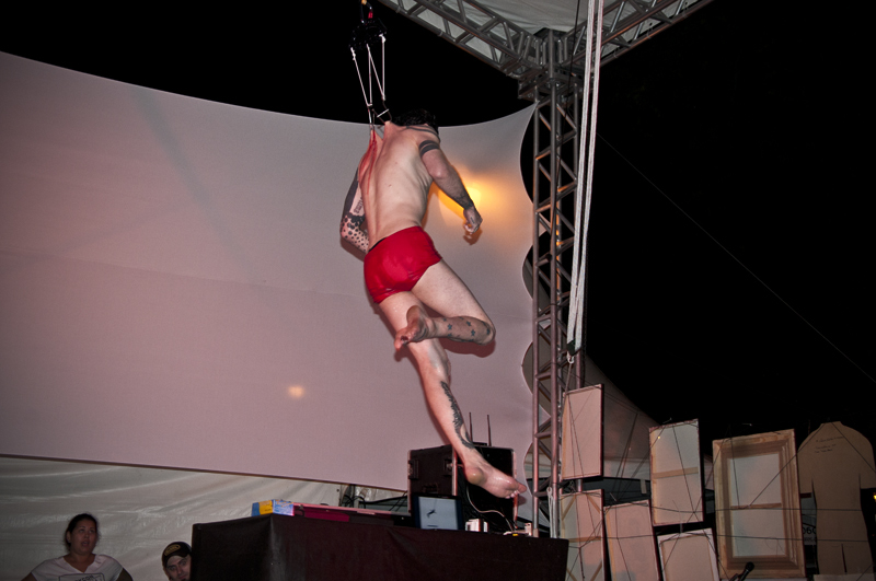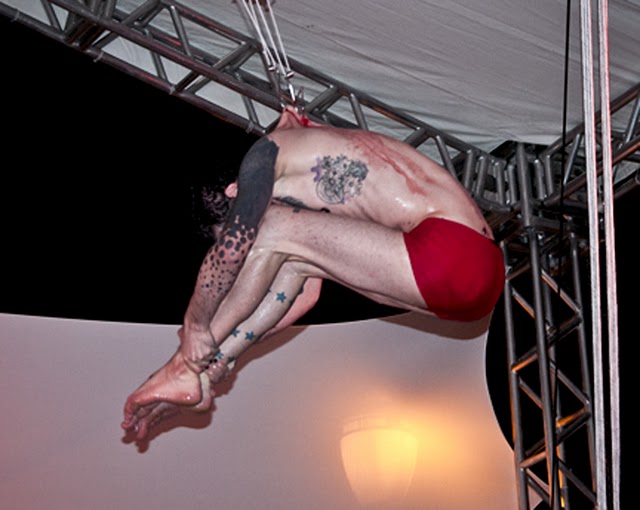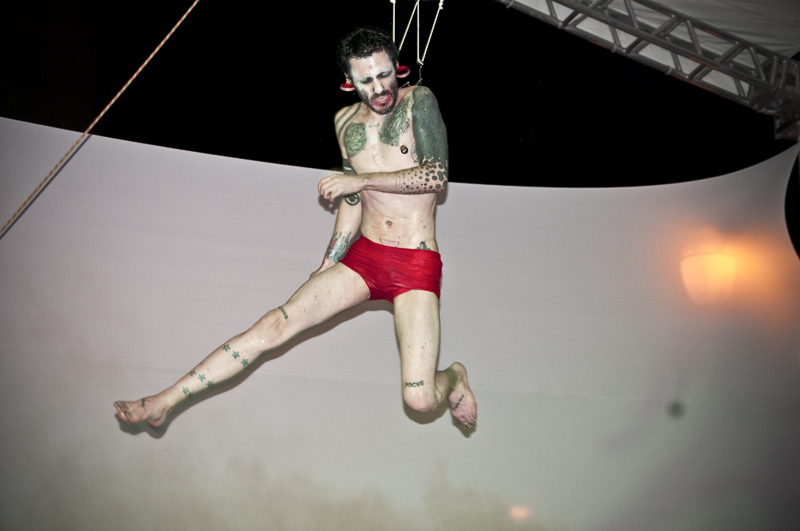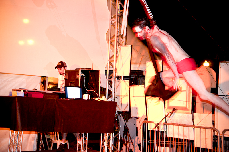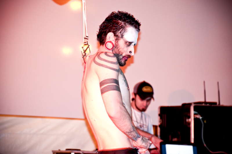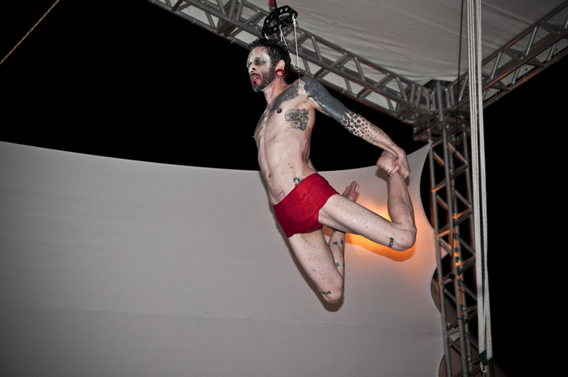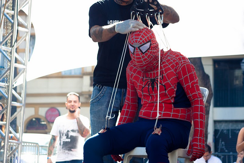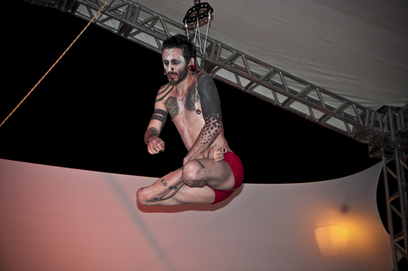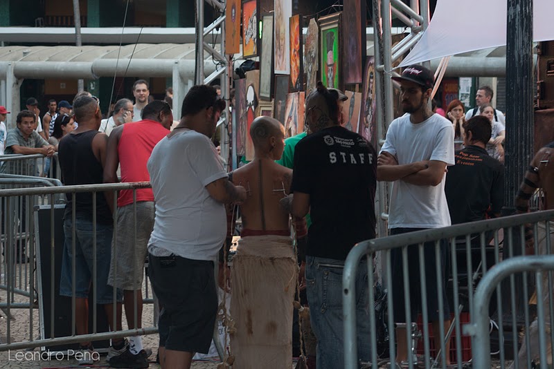 Como se esperava (ou não) o palco recebeu diversos trabalhos no campo da body art, arte da performance, demonstrações de suspensões corporais e outras manipulações corporais, como o belíssimo Kavadi realizado por Peco. Na maioria dos casos – e não em todos – a suspensão corporal foi uma ferramenta para a execução de diversos trabalhos de arte. Falamos isso, por defendermos a ideia de que nem toda suspensão pode ser considerada como uma manifestação artística, o que por sua vez não retira a validade intrínseca de valores sentimentais pessoais, ritualística e a forte carga cultural da ação em si. Em todo caso, para muitos curiosos o palco apresentou apenas alguns corpos pendurados por ganchos, perspectiva esta que perde e muito o contexto e a profundidade de cada trabalho.
