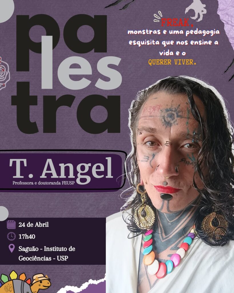 O Coletivo Geobixas que surgiu no Instituto de Geociências da USP receberá no próximo 24 de Abril, às 17:40, uma palestra com a professora e pesquisadora T. Angel. Intitulada como “Freaks, monstras e uma pedagogia esquisita que nos ensine a vida e o querer viver”, a conversa mobiliza saberes outros de cuidado, afeto e resistência.
