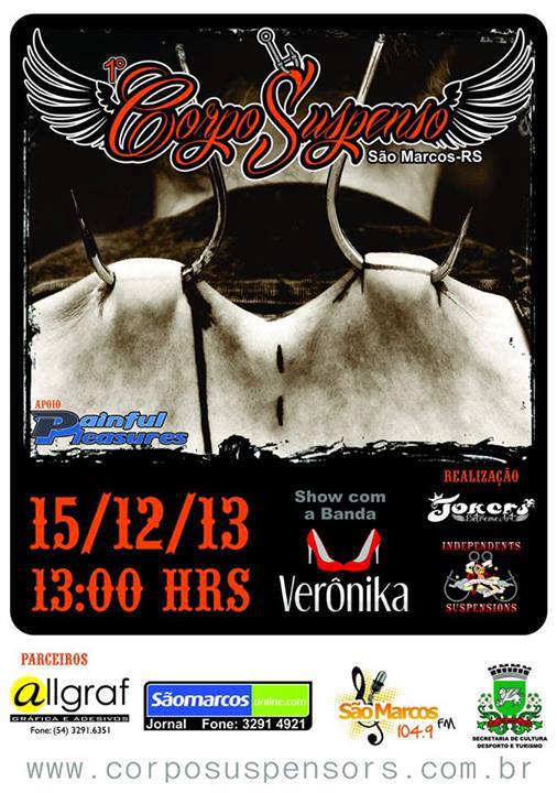Há algum tempo a suspensão corporal vem acontecendo em São Marcos (Rio Grande do Sul), local onde acontece o “1º Corpo Suspenso”, em dezembro de 2013, e logicamente, há algum tempo tem aguçado a curiosidade dos pacatos moradores dessa modesta e agradável cidade na Serra Gaúcha.