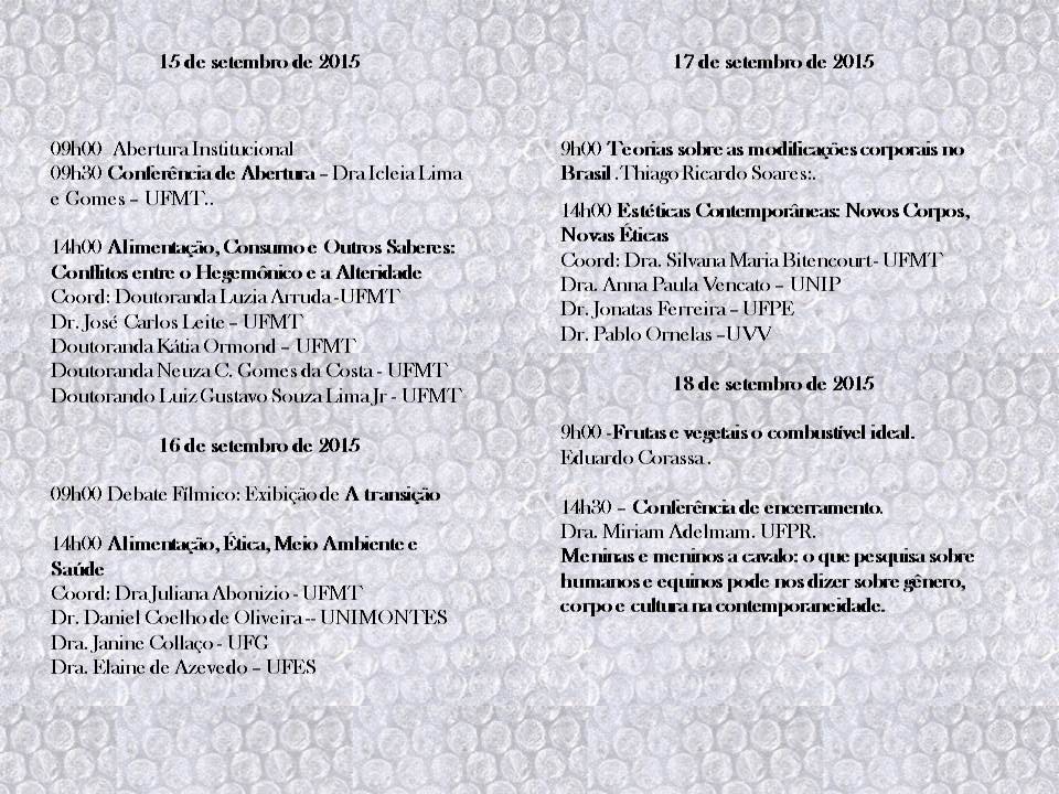 De 15 a 18 de Setembro acontece na UFMT – Universidade Federal do Mato Grosso o evento ‘Corpo, Consumo e Saúde’. Dentro da programação acontecerá o lançamento do livro ‘A modificação corporal no Brasil -1980,1990‘ de Thiago Soares, ‘Drogas e Governabilidade Neoliberal’ de Pablo Ornellas Rosa, ‘Revolução Vegana’ de Eduardo Corassa, dentre outros títulos. A organização do evento é de Dra. Juliana Abonizio e Dra. Silvana Bitencourt.