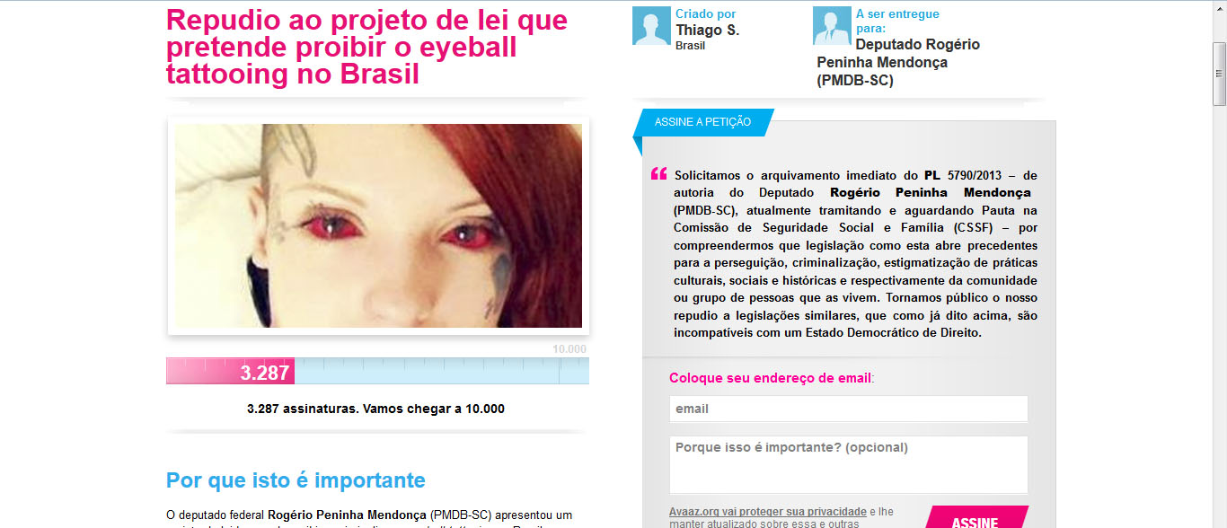 A petição de repudio ao projeto de lei que pretende proibir o eyeball tattooing no Brasil está online no Avaaz desde junho de 2014. Nesse período conseguimos 3287 assinaturas e apesar de não ser nem a metade do que desejaríamos, é um número bastante significativo. Conseguimos apoio internacional e principalmente um forte suporte de pessoas de fora da comunidade da modificação corporal.