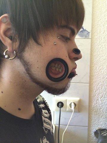 Punky: Danny do Rock the Body Studio em Baden (CH) foi o primeiro a fazer o corte inicial para 10mm. Antes disso eu estava por quatro anos com 1,6 mm nas bochechas. Depois de três meses que eles cicatrizaram completamente fiz um novo corte para 18 mm. Este cicatrizou em um mês. Então, eu alarguei para 22mm em etapas de 1mm. Depois disso cortei para 30 mm, em direção da boca para tirar a pressão, e eles não deformaram tanto como quando eu somente alarguei.