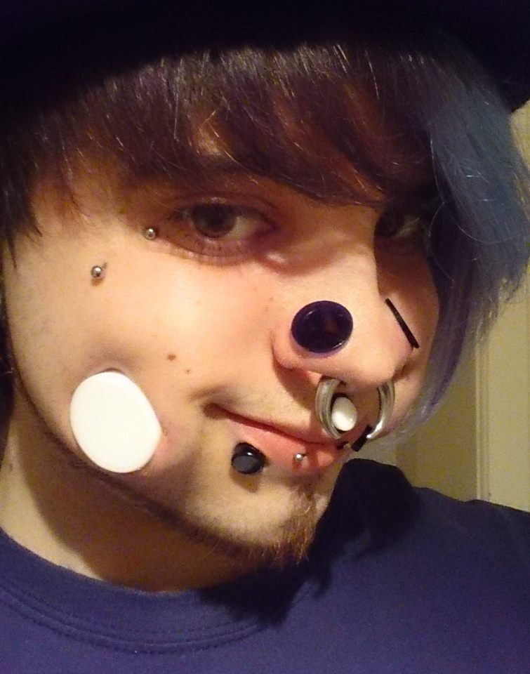 Punky: Eu tenho: 2x Antieybrow 1,2mm, 2x Big Nostril 15mm, Big Septum 9mm, Big Medusa 9mm, 2x Big Snakebites 16mm, 2x Big Cheeks 36mm, Horizontal Lip Surface 1,2mm, Tongue splitting, 2x Conch 1,6mm, 2x Outer Conch 1,6/9mm, 3x Streched Lobes mas eu não usa joia, transverse Lobe 8mm, Ear Cropping one split in left helix, 2x Nipple 1,6mm, 2x Deep Chest 8mm, Mayadragon-cutting nas costas, Microdermal no olho do dragão, Magnetimplant, PA 8mm, Frenum 1,6mm, Transcrotal 35mm, Anarquia-branding na minha bunda, Cutting abaixo do meio do meu peito, Gorillaztattoo na perna esquerda, braço e peito de black tattoo, não finalizei a tatuagem da mão direita com um blackwork geométrico, 2x Nascalinetattos na minha barriga.