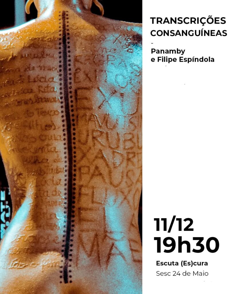Transcrições Consanguíneas é uma aparição de corpo sonoro onde Panamby lê textos autorais ao microfone enquanto Filipe Espindola transcreve fragmentos da fala em suas costas utilizando uma máquina de tatuar sem tinta. No processo de escarificar, as palavras brotam sanguíneas no tecido vivo e geram um novo texto a partir do exercício da escuta em meio à verborragia e cacofonia.