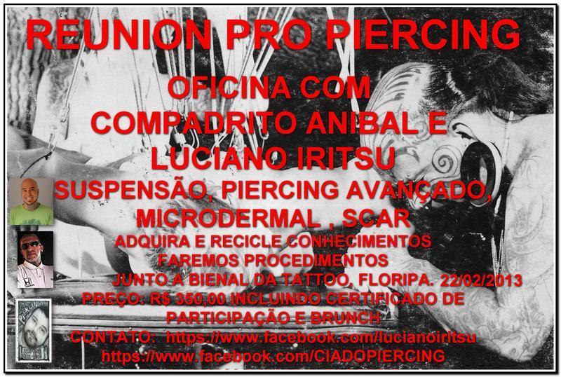 No dia 22 de Fevereiro acontecerá em Floripa o evento Reunion Pro Piercing, que contará com uma oficina sobre técnicas do piercing e da suspensão corporal. A oficina será ministrada pelos profissionais Luciano Iritsu (SP), Compadrito Anibal (Peru) e Fabrício Cardoso, que também é quem organiza e realiza o evento.