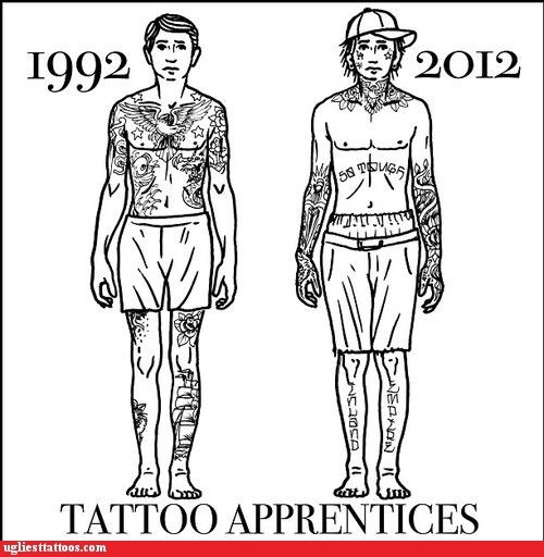 Não é de hoje que percebemos na comunidade da modificação corporal que existe um certo incomodo com as pessoas que hoje tatuam pescoços, mãos e rostos antes de tatuar as partes que são ou poderiam ser facilmente escondidas pelas roupas. Em tempos de redes sociais obviamente que já se elaboraram um gráfico para se falar sobre isso, o que sempre tem acontecido com um tom de crítica negativa ou caindo de fato para um discurso preconceituoso que indica que isso seja algo ruim e/ou que não deveria acontecer. Abaixo reproduzimos os dois gráficos mais comuns que usualmente circulam pelas redes sociais.