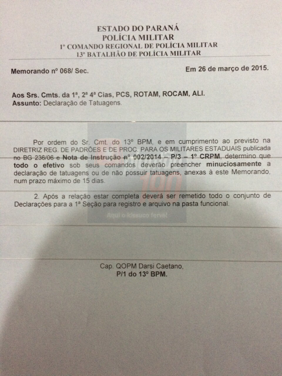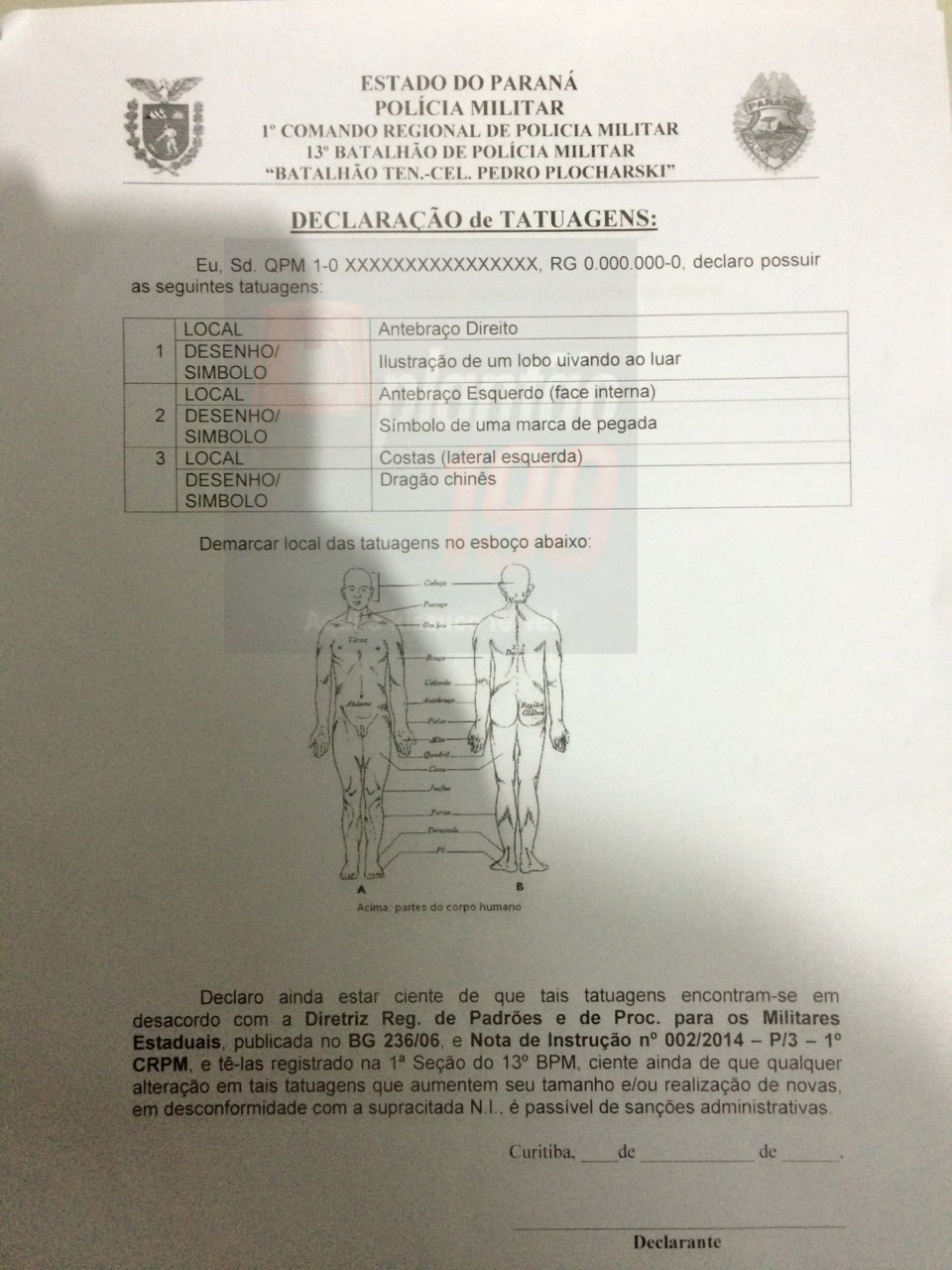 Um memorando, o qual compartilhamos abaixo, do 13° Batalhão da Polícia Militar em Curitiba causou um desconforto em diversos policiais militares do batalhão. A determinação exige que todos os policiais deverão preencher minuciosamente uma declaração de tatuagens ou de não possuir tatuagens em num prazo máximo de 15 dias. O documento deixa claro e reforça o tempo todo que as tatuagens estão em desacordo com a Diretriz Regional de Padrões e de Procedimentos para os Militares Estaduais.