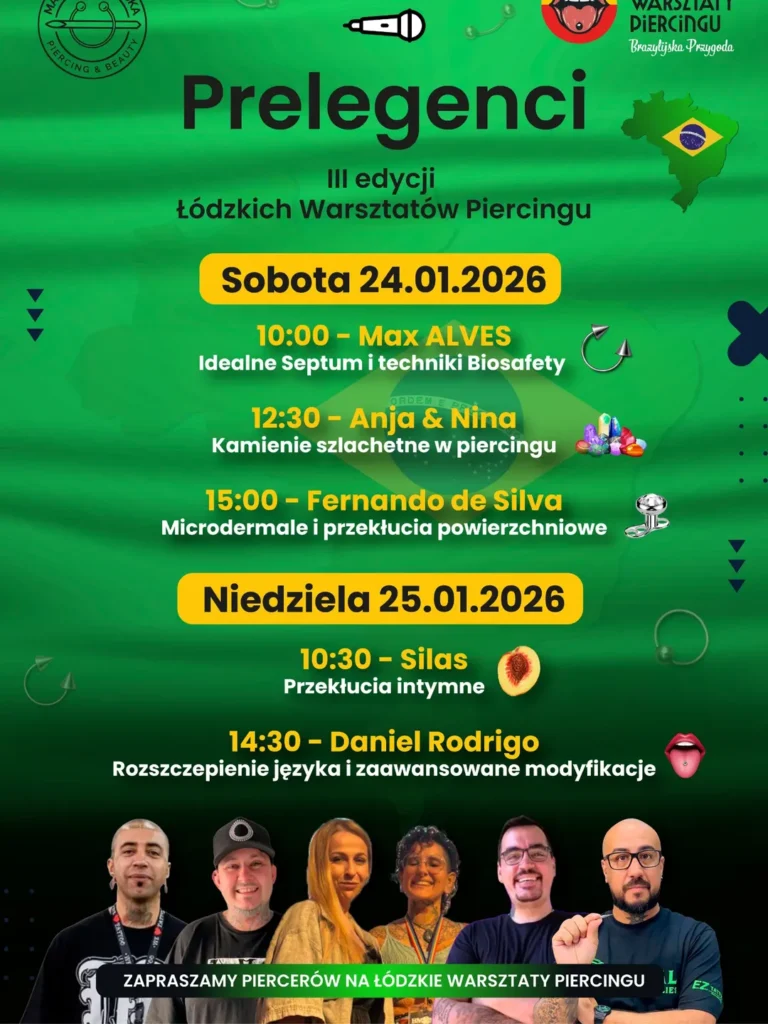 E 2026 está começando com tudo e nos surpreendo bastante. Agora no dias 24 e 25 de Janeiro de 2026 teremos um workshop de piercing em ?ód?, Polônia. A presença brasileira para ministrar aulas é enorme, algo que nunca vimos antes em nenhum evento estrangeiro, nem mesmo na América Latina.