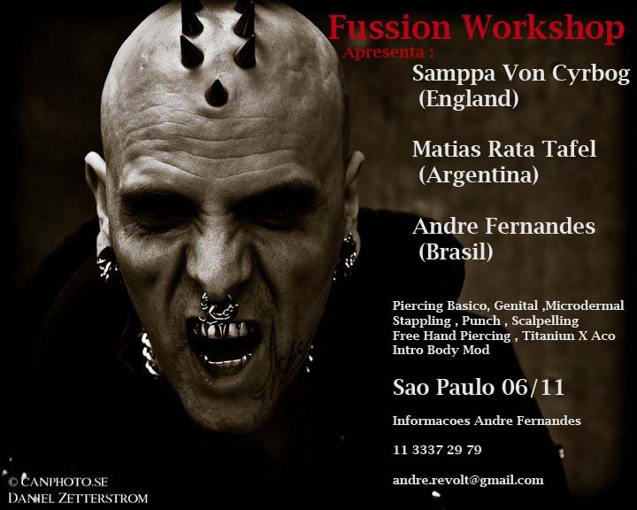 Recentemente um dos precusores da modificação corporal no Brasil, Andre Fernandes, divulgou em sua página no facebook a visita no Brasil de Samppa Von Cyborg (Inglaterra). Já temos inclusive a data, 06 de Novembro. Inicialmente foi divulgado um workshop, que também contará com a participação do argentino Matias Rata Tafael.