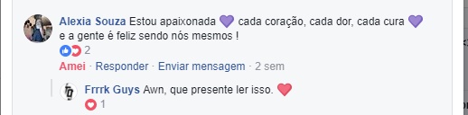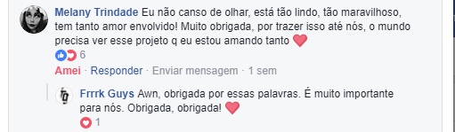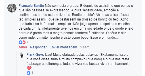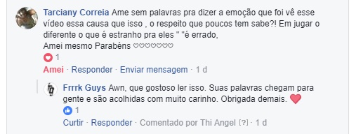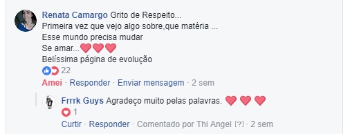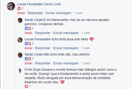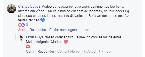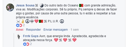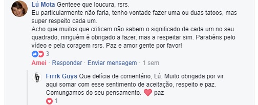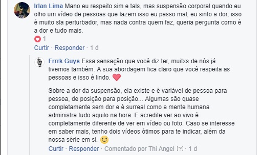 São dez comentários de centenas e centenas que estamos a receber. E como a cereja do bolo não poderia faltar, houveram os comentários das pessoas que não são adeptas das modificações corporais ou da suspensão, que não acham bonito e que até sentem um certo desconforto com a suspensão especificamente e, ainda assim, tratando tudo com o maior respeito. Uma aula de cidadania e de abraço as pluralidades humanas em suas totalidades.