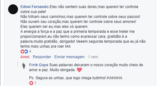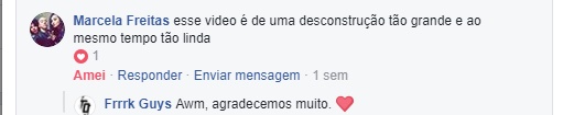 E você deve estar a pensar: mas vocês estão dentro das bolhas de proteção de seus grupos. Nós pensamos isso também no início. Mas veja, quando percebemos que o vídeo havia passado de 100 mil visualizações, já não tínhamos mais esse controle, a nossa bolha não havia sido perfurada, e sim estourada completamente. O nosso trabalho estava apenas ali, circulando, girando, caminhando e nos trazendo como retorno as melhores reações que não poderíamos nem ao menos esperar (por conta da quantidade de pedrada que tomamos ao longo da vida). E falamos não só das reações escritas. Houveram aquelas tantas reações que não eram ditas e sentidas por nós, como as pessoas seguindo tudo o que era relacionado com o trailer. Ao nosso entendimento foi: deixe-me ficar mais perto. E ainda um pouco e outro mais. E nós, do lado de cá, apenas tentando – quando possível individualmente – responder: se acheguem mais é disso que precisamos, afetos, oceanos de afetos.