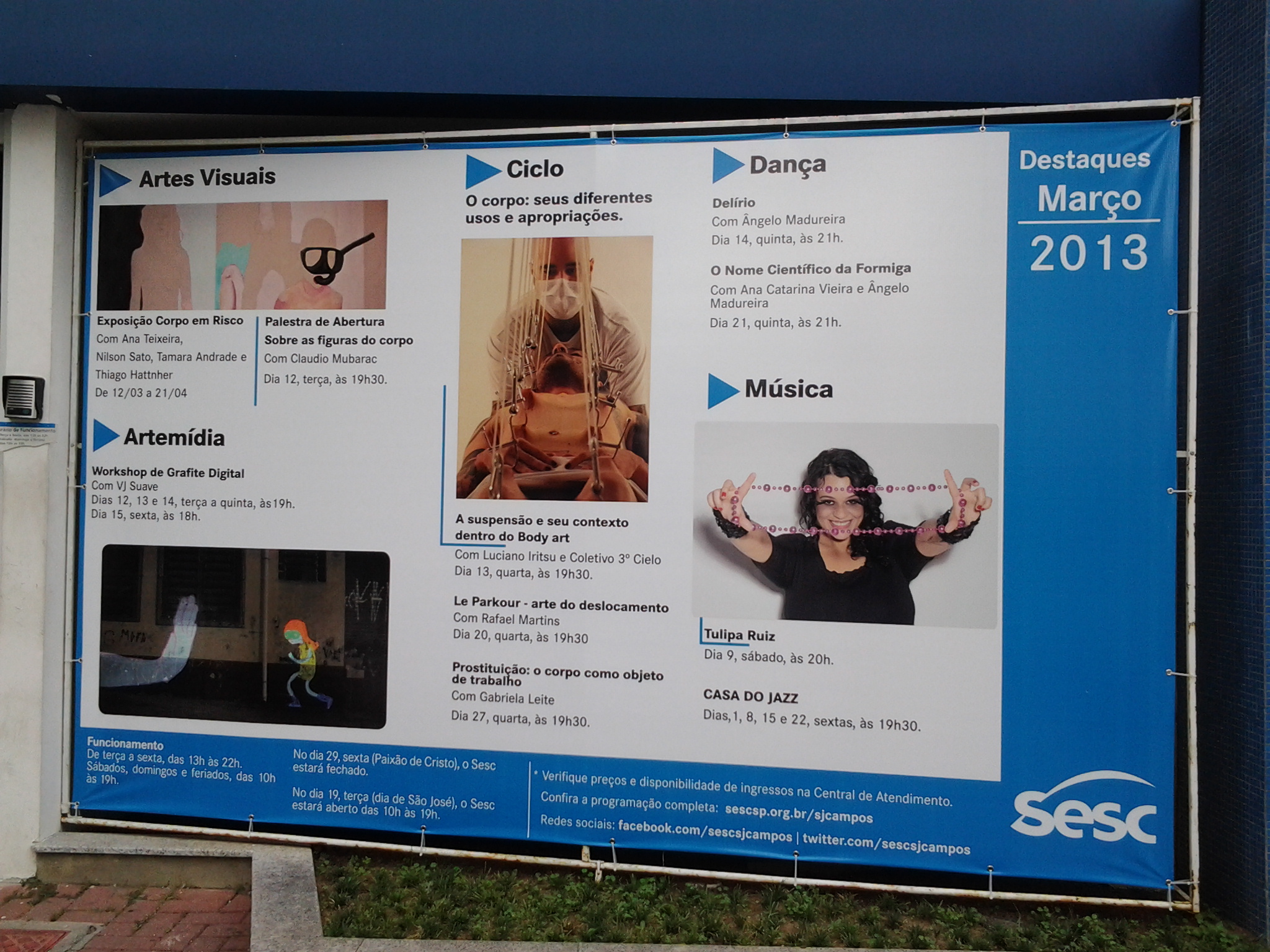 Notas importantes, na frente do SESC havia um cartaz grande com a programação do mês e uma foto de suspensão corporal era exibida para quem quisesse ver. Segundo a organizadora do encontro, a imagem arrancou elogios, críticas e reações de espanto. No nosso ponto de vista a escolha foi digna apenas de elogios, pois trataram a questão com a seriedade e maturidade que se deve ter. Seria inviável querer discutir sobre arte contemporânea, performance art e body art ocultando o corpo ou os seus usos. Ainda dando sequência nas notas, não podemos deixar de mencionar que o encontro rendeu uma matéria de página inteira no jornal local. São José dos Campos realmente estava disposta a discutir a suspensão.
