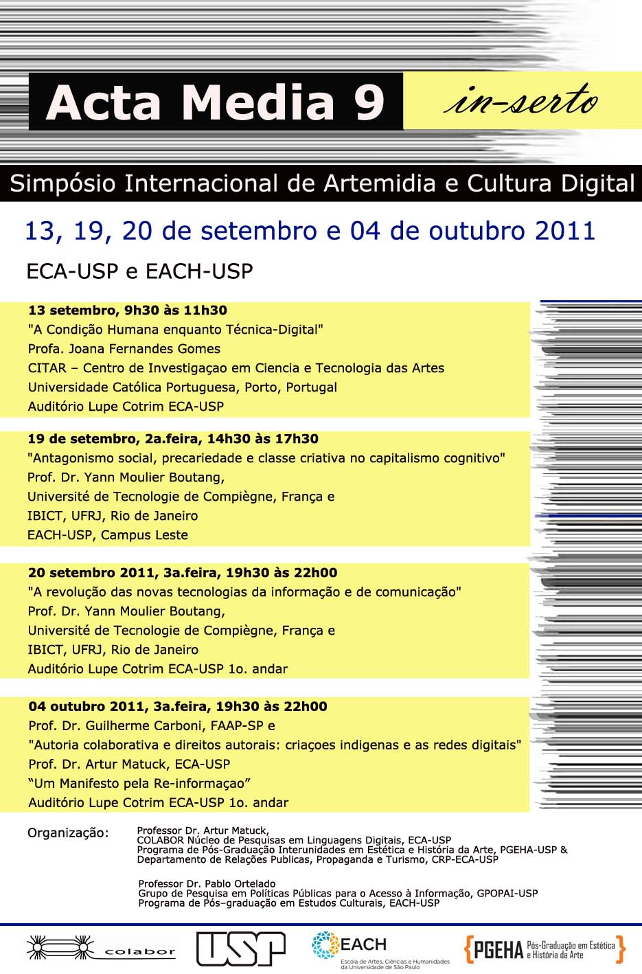 O 9º Simpósio Internacional de Artemídia e Cultura Digital – Acta Media 9 In-Serto será realizado nos meses de setembro e outubro de 2011, na Escola de Comunicações e Artes (ECA) e na Escola de Artes, Ciências e Humanidades (EACH), da Universidade de São Paulo. O Simpósio tem por objetivo apresentar para a comunidade, especialmente da USP, o pensamento e a reflexão atuais de especialistas em Comunicação, Arte e Cultura Digital. O evento é gratuito e não requer inscrição.