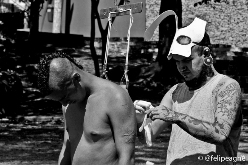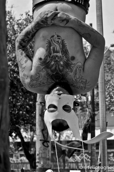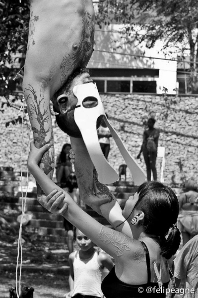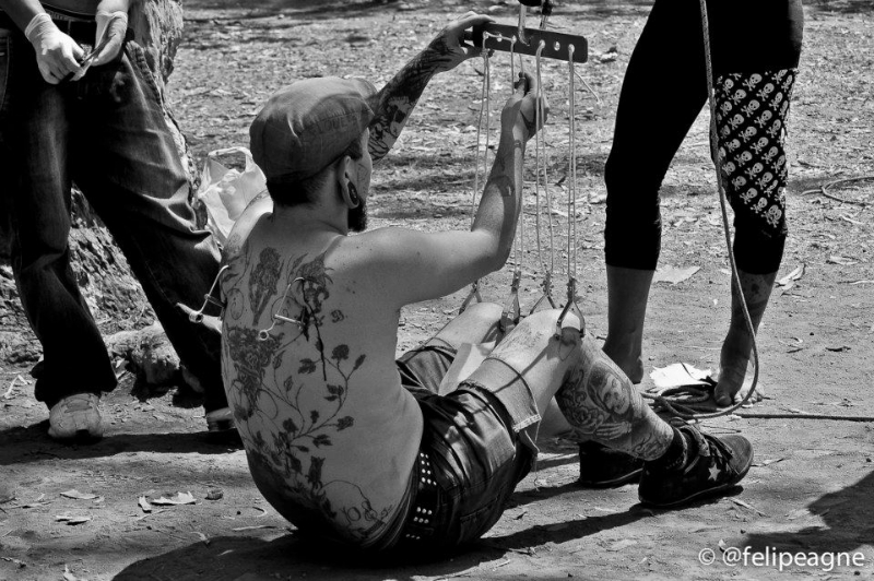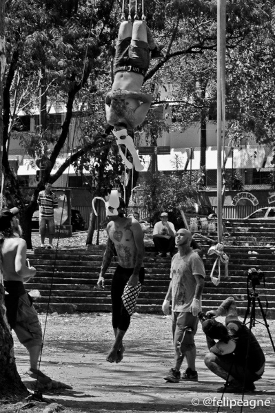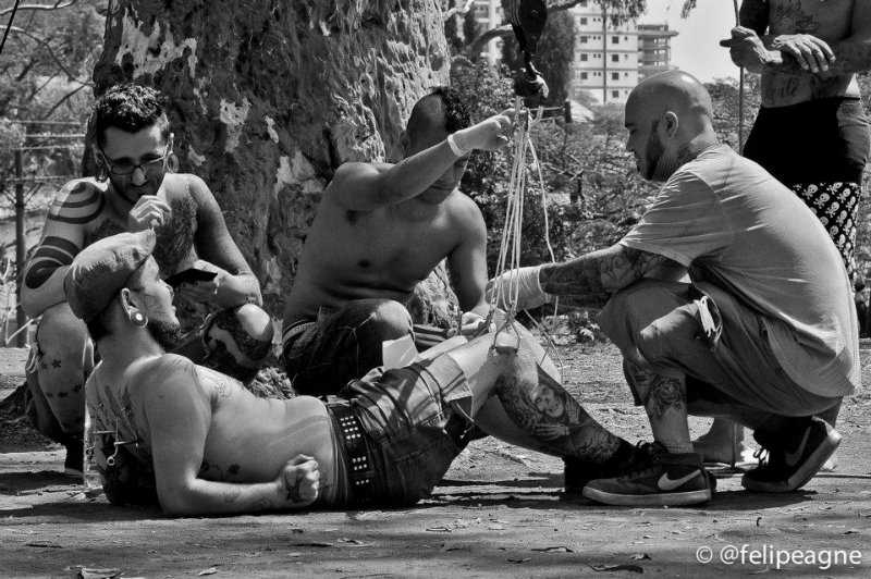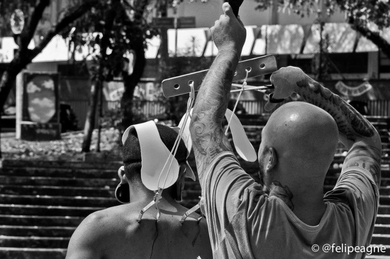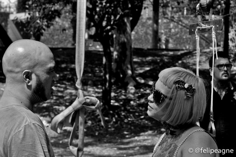 Importante mencionar que as suspensões aconteceram em uma praça pública de São Paulo, dividindo espaço com crianças correndo, pessoas passeando com seus cães e etc. Importante pontuar isto, pois todas as atividades co-habitaram o mesmo espaço na mais total harmonia. Sabemos que a cidade de São Paulo enfrenta uma série de proibições à inúmeros tipos de atividades em espaço público, e sendo a suspensão corporal estigmatizada não nos surpreenderia ter o belo domingo estragado por pressão da polícia militar da cidade. Esta por sinal, esteve presente pela praça, mas não impediu a continuidade dos processos.