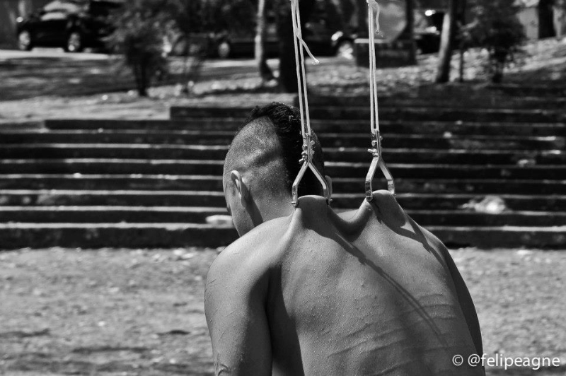 Fim de inverno com cara de alto verão. A sensação térmica passava dos 30º e o sol brilhava intensamente. Assim era o domingo em que essa série de fotografias aconteceram. Era um encontro de amigos que comemoravam os aniversários de dois dos presentes. A forma escolhida de celebração? A suspensão corporal.
