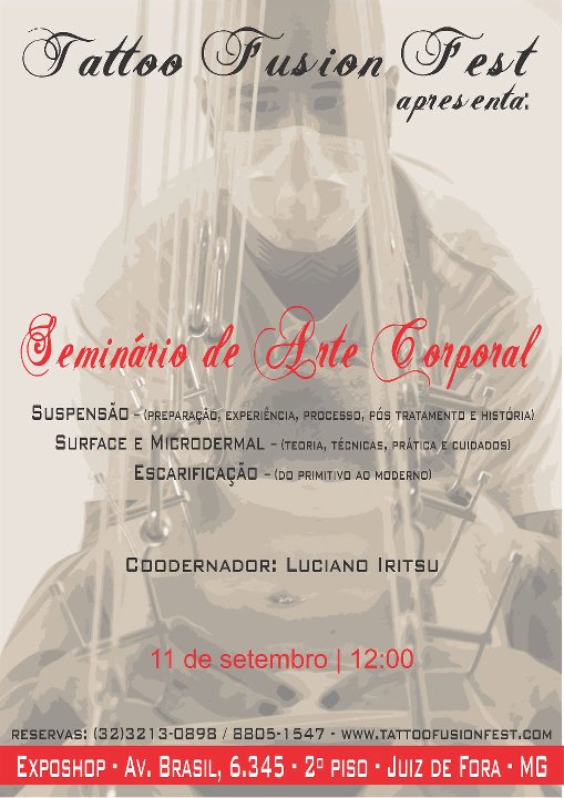 Tattoo Fusion Fest é um evento que tem por objetivo a divulgação da cultura da tatuagem vista como arte e a formação de uma nova geração de tatuadores mais conscientes e preparados para todas as dificuldades e riscos da profissão, além de abrir espaço para outras formas de expressão da arte. Para isso, teremos a presença de tatuadores renomados nacional e internacionalmente, artistas plásticos, grafiteiros, batalha de mc’s , workshops e um profissional de modificação corporal ficará por conta de realizar uma suspensão.