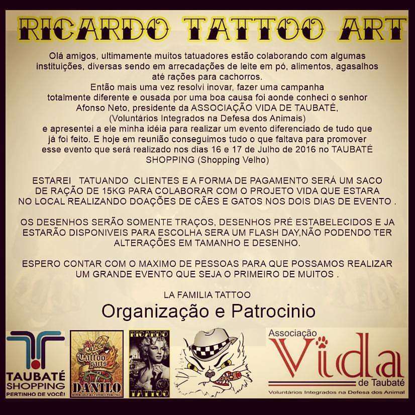 (Foto: Divulgação/Ricardo Tattoo Art)Durante o próximo final de semana, dias 16 e 17 de Agosto, acontecerá uma ação bastante importante que relaciona a tatuagem e a causa animal em Taubaté, interior de São Paulo.