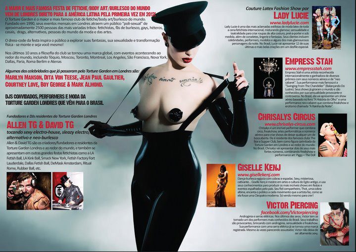 Dois mil e doze começou realmente com muita força. Este é o ano em que a principal festa de fetiche do mundo, o Torture Garden, chega ao Brasil, com edições em São Paulo e Rio de Janeiro. De longe é algo que não imaginávamos que fosse acontecer.