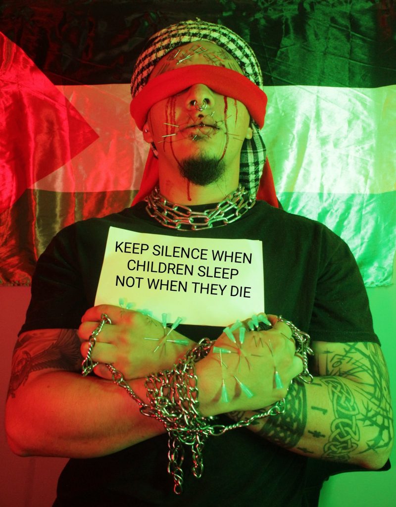Um artista colombiano fez um trabalho intitulado “Silence kills” (O silêncio mata, tradução nossa) utilizando o seu corpo para se juntar com as vozes e lutas que pedem por uma Palestina Livre e que buscam inclusive trazer visibilidade para o que Israel tem feito, ironicamente, assassinato em massa de um povo.