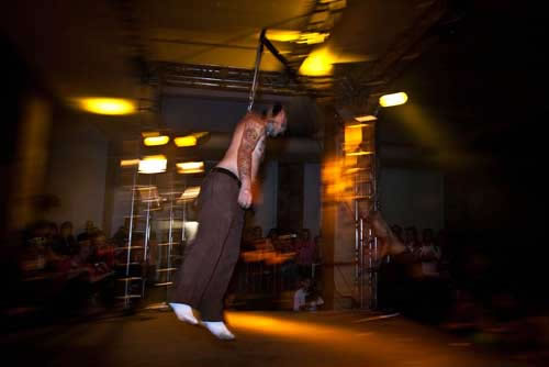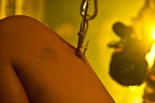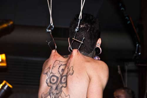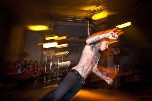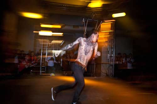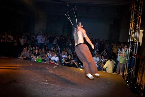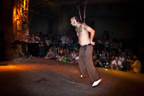 Logo que cheguei pude ver o francês Lukas Zpira que era, sem dúvida alguma, uma das atrações mais esperadas do evento. Enquanto estava me arrumando no camarim, já fui informado que Zpira tinha ido embora e não se apresentaria mais. Fui tomado por várias questões e uma ligeira tristeza, afinal de contas, queria realmente ver o trabalho inédito do artista. Mas o evento segue, o palco alternava as atrações com suspensões corporais, bandas, dj’s e performances. Foram inúmeras suspensões e das mais variadas formas, suicide, knee, superman e assim por diante. Durante a madrugada do evento, apresentei uma sequência de performances com o duo Diva Muffin. Logo na sequência aconteceu o fantástico freakshow do artista Freak Garcia. Passávamos das 14 horas de evento, o sol já brilhava forte em São Paulo, acordando aqueles que dormiam embriagados pelas ruas da cidade. Aos poucos vão entrando no palco três corpos nus, era chegada a hora da performance “Aurora das máquinas abertas”. Filipe Espindola, Sara Panamby, Rafael Rosa e os músicos do ORBE preencheram cada fresta daquele imenso salão, com uma beleza e força quimérica. Os artistas se perfuram no palco, lentamente cada qual ganha sua posição e alcançam o ar. Não eram mais humanos, eram deuses. Se transformaram em máquinas abertas da profundidade em ser.