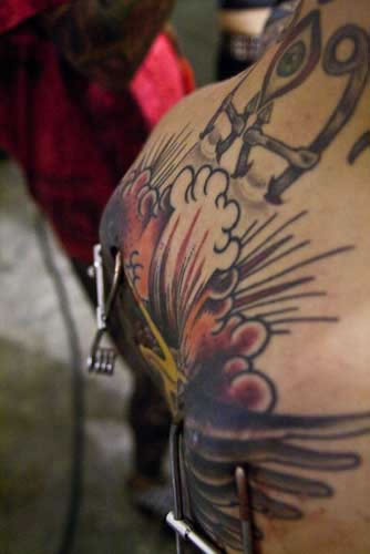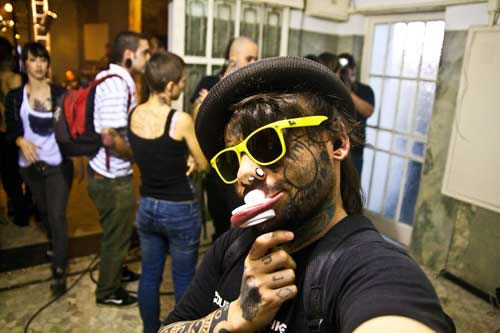 Na entrada da Galeria foi montado uma “sala aquário”, onde por 24 horas tatuadores se revezaram e mostraram seus trabalhos e estilos. A sensação que se tinha dentro do aquário era um bocado surreal, era possível ver o Teatro Municipal e a incessante multidão que passava para olhar o que acontecia naquela sala de vidro. Entre os profissionais que mostraram seus trabalhos estavam André Cruz, Nicolas, Fernando Fefs, a futura mamãe Renata Giannoni, entre outros. Adentrando os espaços da Galeria era possível ver uma pequena exposição com informações, banners e fotos sobre as práticas da body mod. Mas era um pouco adiante que o palco estava montado e o público se concentrava.
