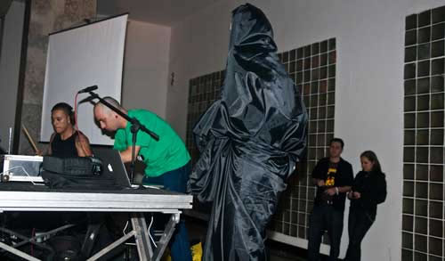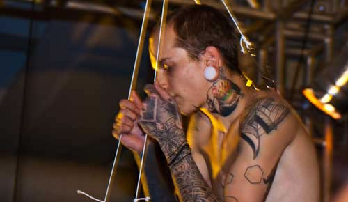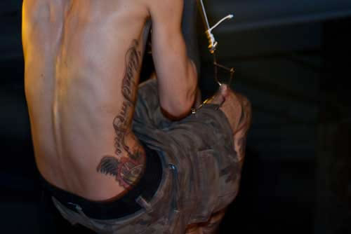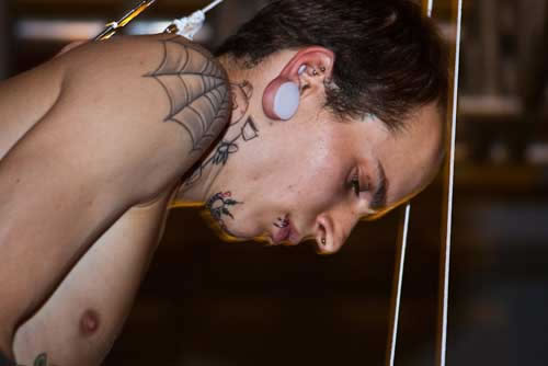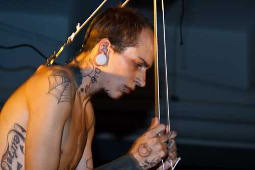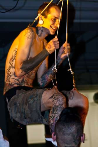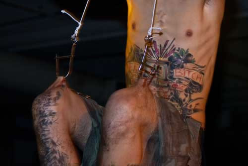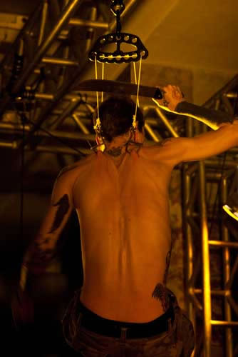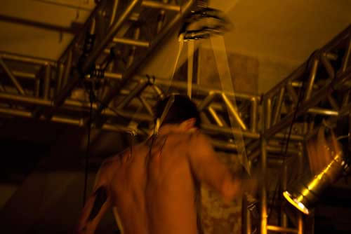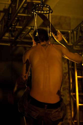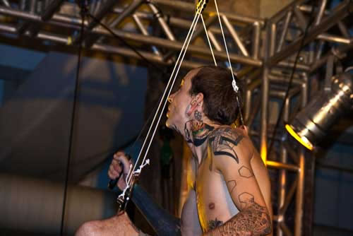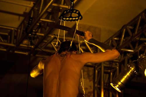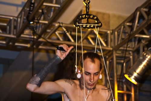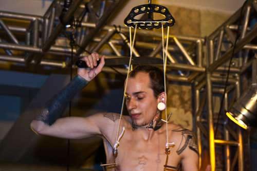 Logo que cheguei pude ver o francês Lukas Zpira que era, sem dúvida alguma, uma das atrações mais esperadas do evento. Enquanto estava me arrumando no camarim, já fui informado que Zpira tinha ido embora e não se apresentaria mais. Fui tomado por várias questões e uma ligeira tristeza, afinal de contas, queria realmente ver o trabalho inédito do artista. Mas o evento segue, o palco alternava as atrações com suspensões corporais, bandas, dj’s e performances. Foram inúmeras suspensões e das mais variadas formas, suicide, knee, superman e assim por diante. Durante a madrugada do evento, apresentei uma sequência de performances com o duo Diva Muffin. Logo na sequência aconteceu o fantástico freakshow do artista Freak Garcia. Passávamos das 14 horas de evento, o sol já brilhava forte em São Paulo, acordando aqueles que dormiam embriagados pelas ruas da cidade. Aos poucos vão entrando no palco três corpos nus, era chegada a hora da performance “Aurora das máquinas abertas”. Filipe Espindola, Sara Panamby, Rafael Rosa e os músicos do ORBE preencheram cada fresta daquele imenso salão, com uma beleza e força quimérica. Os artistas se perfuram no palco, lentamente cada qual ganha sua posição e alcançam o ar. Não eram mais humanos, eram deuses. Se transformaram em máquinas abertas da profundidade em ser.